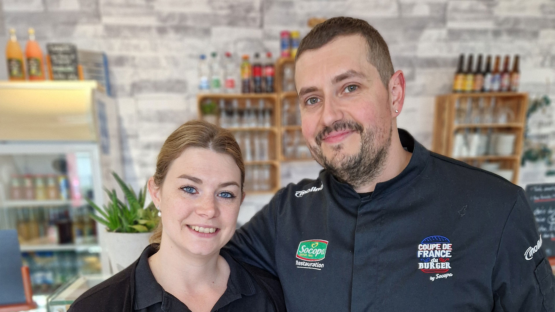 Légende : Laura et Sébastien Doucey au cœur du restaurant familial, Légumez-moi. La spécialité du chef ? Un burger gourmet, récompensé d’une médaille d’argent à la Coupe de France du Burger 2025.