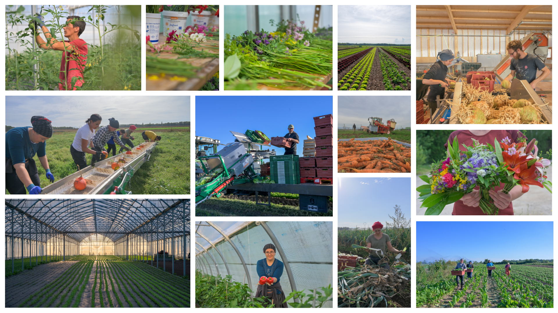 Dans les champs, les serres, l’aire de lavage, jusqu’à la vente directe, 35 personnes travaillent au cœur de la ferme les Chants de la Terre, à Colmar, dont 18 personnes dédiées aux champs. L’été, cette équipe bénéficie du renfort d’une dizaine de saisonniers. Leur terrain de jeu s’étend sur trois parcelles, soit 40 hectares au total, situés à Widensolen. Une équipe « Jardin » est dédiée aux serres, qui s’étendent sur cinq hectares et qui garantissent une rotation des légumes. Quatre personnes s’occupent de leur lavage, leur tri et leur conditionnement.