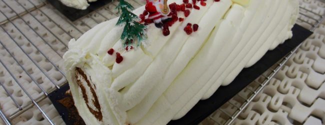 Chaque bûche reçoit plusieurs décors, ici la crème chantilly de côté avec l’application d’un décor traditionnel de poudre de chocolat